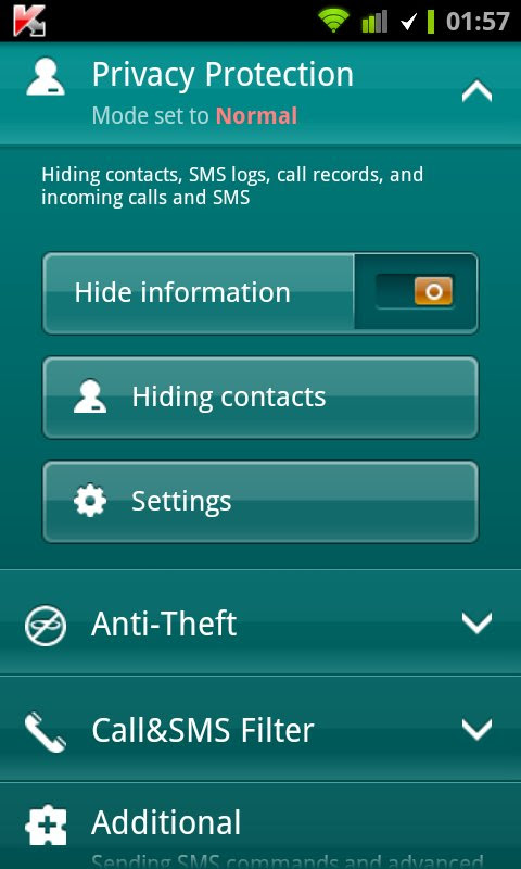 Kaspersky Mobile Security offers you complete peace of mind, knowing that your smartphone and your data have the advanced protection against privacy violation, device loss or theft, annoying calls and messages, as well as malicioussoftware.